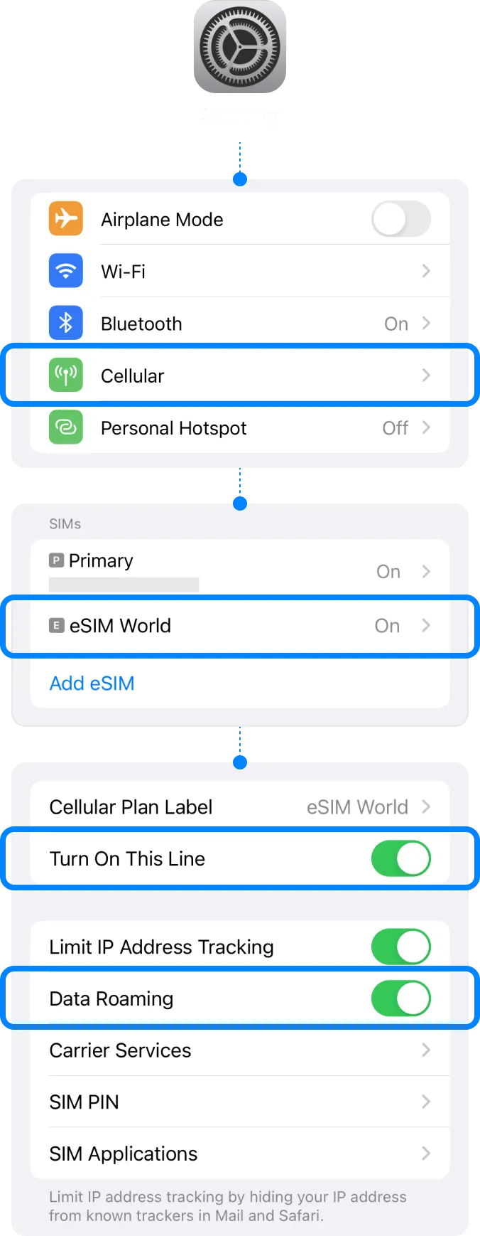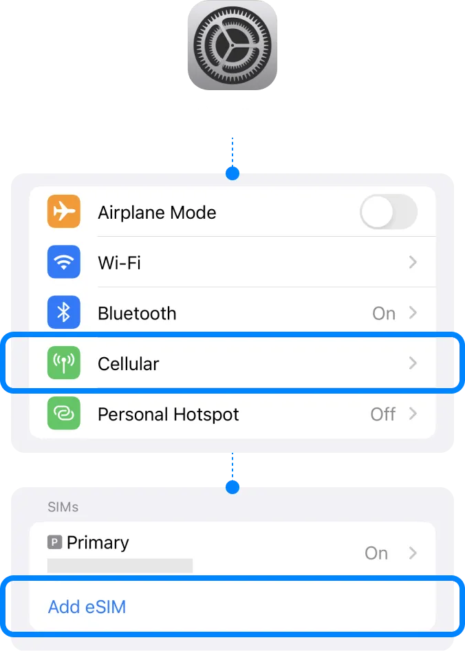 | ▸ | Select [Cellular/Mobile Service] Select our eSIM under the SIMs section. |