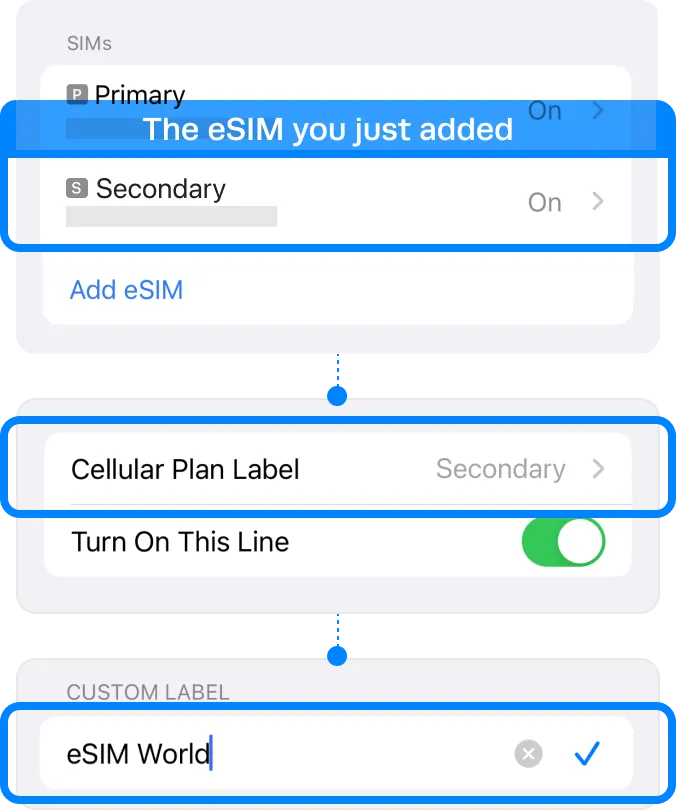 | ▸ | Tap [Cellular Plan Label] Type in the ‘Custom Label’, e.g. {Destination} – eSIM World. |